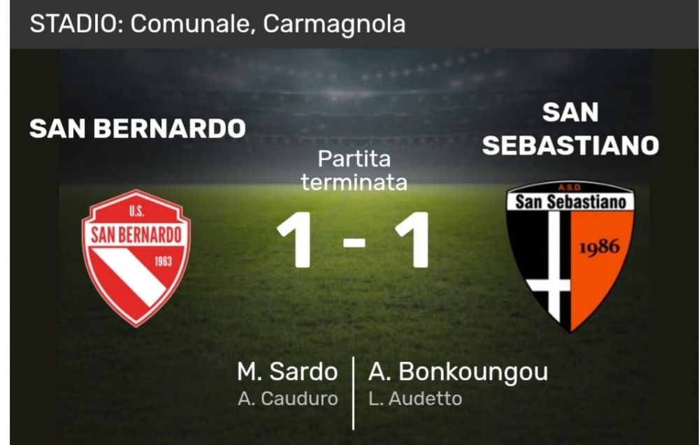 La partita terminata con il pareggio di 1 a 1 confina il San Seba a - 4 punti dal Bisalta che deve ancora recuperare una partita. La gara giocata su un campo reso molto difficile dalla pioggia ha condizionato il gioco del San Seba che ha cercato in ogni modo di fare sua la partita. Primo tempo non troppo bello. Nel secondo dopo varie cavalcate da parte del San Seba verso la porta degli avversari. Ecco che Audetto con un bel passaggio filtrante per Bonkongou lo lancia in porta e con un bel diagonale da destra verso sinistra insacca per il vantaggio dell' 1 a 0. Allo scadere della partita e piu' precisamente al 95', in una mischia, Sardo calcia direttamente in porta e termina la gara con il pari del San Bernardo. Molto amaro il risultato sia per il pareggio sia per il nervosismo in campo. Un recupero beffa che comunque non deve demoralizzare gli arancio/neri in vista delle prossime partite sempre più impegnative nonostante quest'ultima con gli ultimi in classifica.